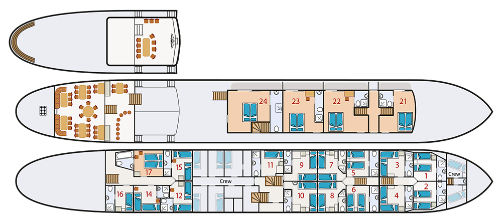 | Dreibettkabinen: Auf Anfrage und begrenzt verfügbar. (Das dritte Bett ist ein erhöhtes Klappbett / Etagenbett | |