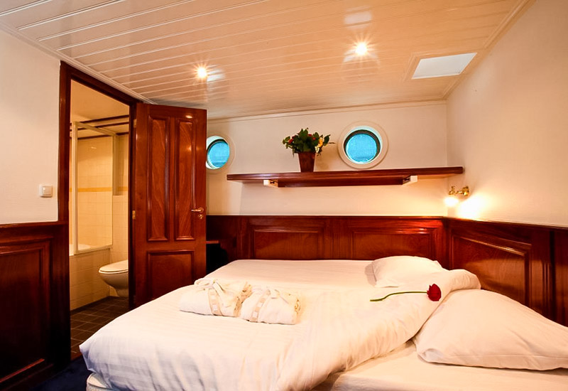 Unter Deck erwarten Sie zwölf großzügige Zweibettkabinen (ca. 11–13 m²). Jede Kabine bietet: